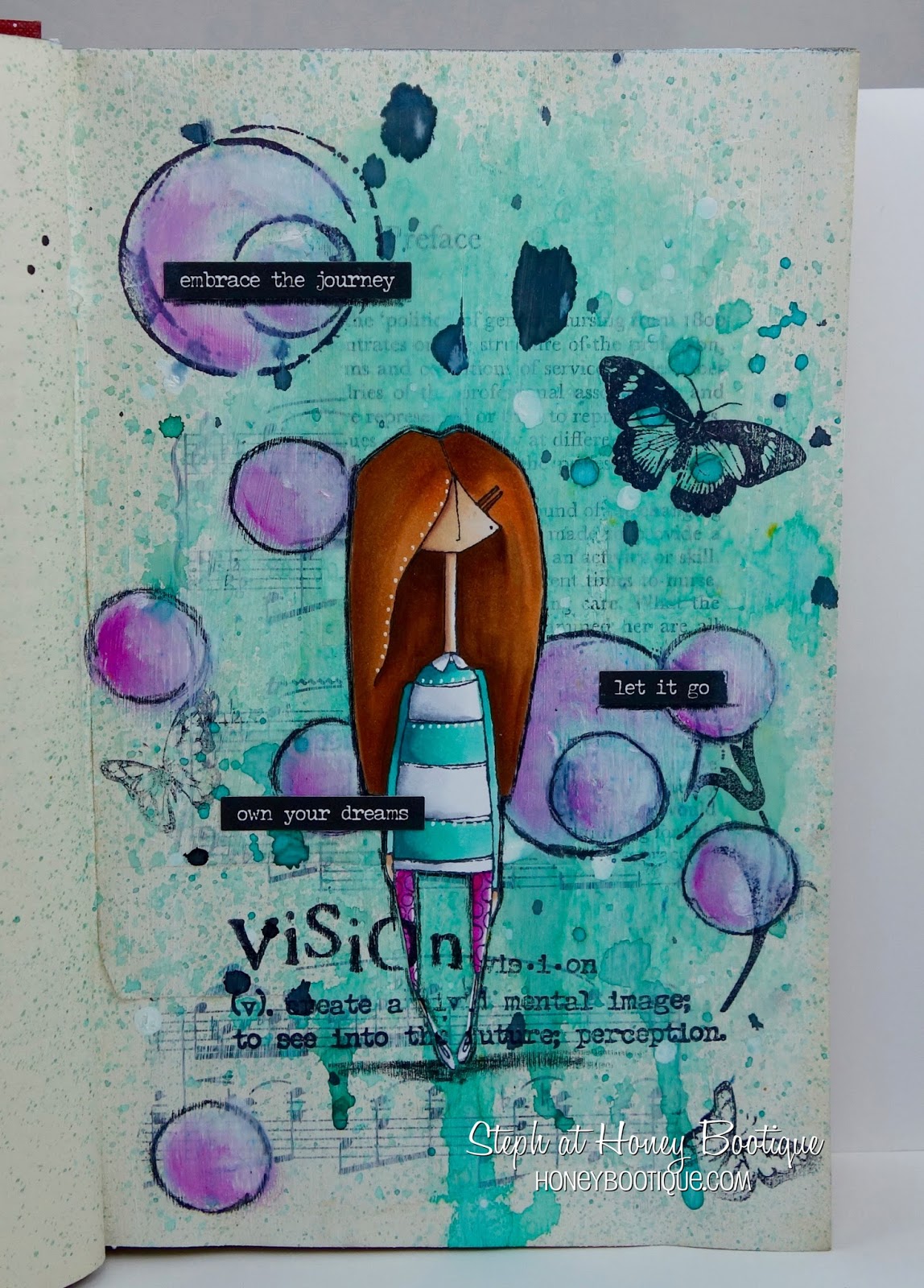 I used a vintage book and glued several pages together and then stuck down some sheet music and other book pages with masking tape and then covered the page with white gesso. I then sprayed the page with Lindy's sprays (see below for colours) and then splattered with the black spray and a Tim Holtz White Picket Fence distress spray. I then stamped the background using Stamping Bella's Java Spills which I coloured with gelato and smudged with my finger. I also stamped the main butterfly from Stampington's Time and the mini butterflies and flower from Hero Art's Friend. I stamped Stamping Bella's Danielle Donaldson's Mostly Naomi on copic paper and coloured with copics. I cut out and glued to the page and then outlined with a hard pencil. I then stamped Visible Image's "vision" from their Where Dreams Take You set over the top of her legs. I then added some white gel pen highlights and some Tim Holtz word stickers which I also outlined with heavy pencil. And that's it!!